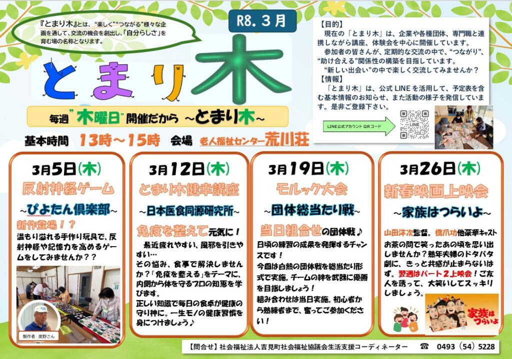 地域交流の拠点として開設した「とまり木」について、3月予定をお知らせします。