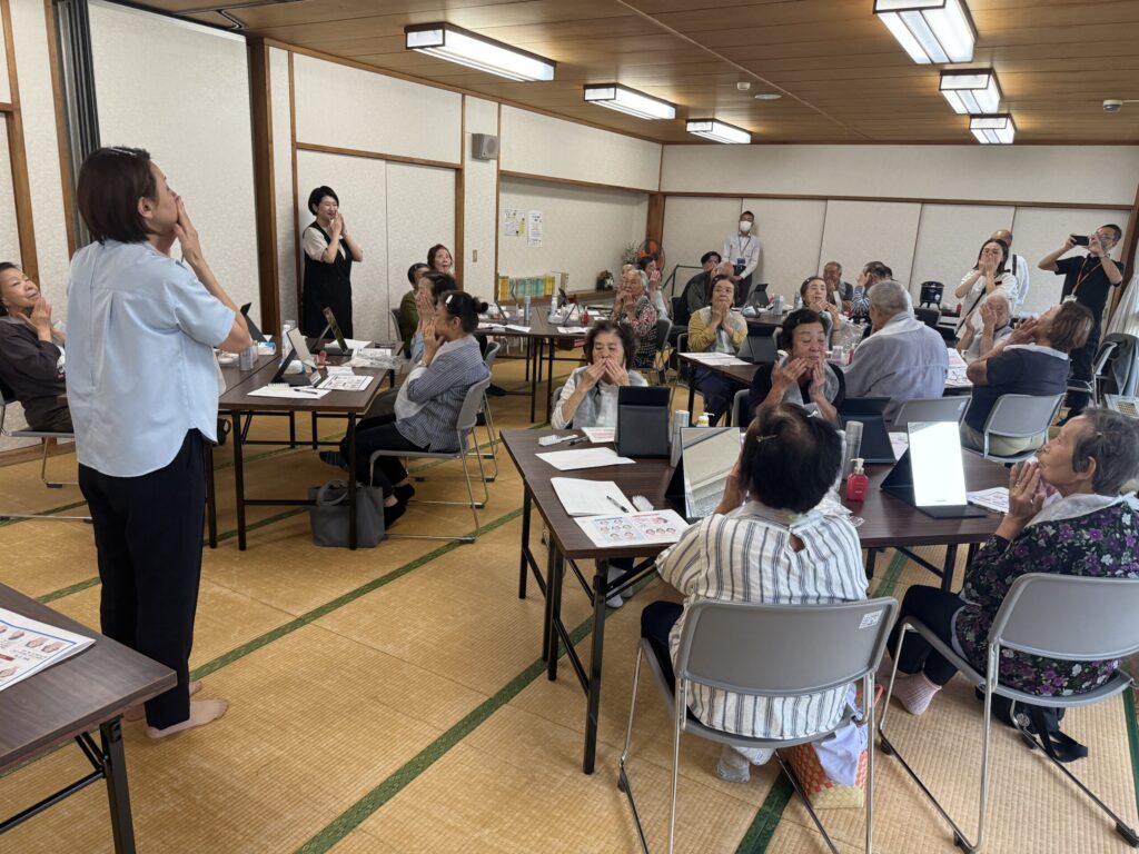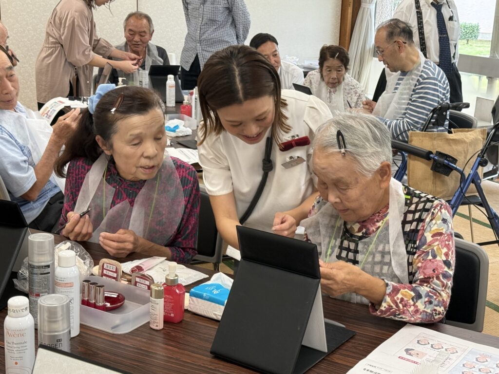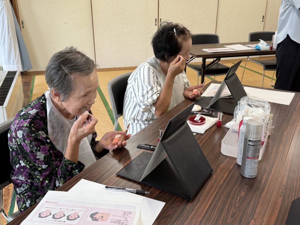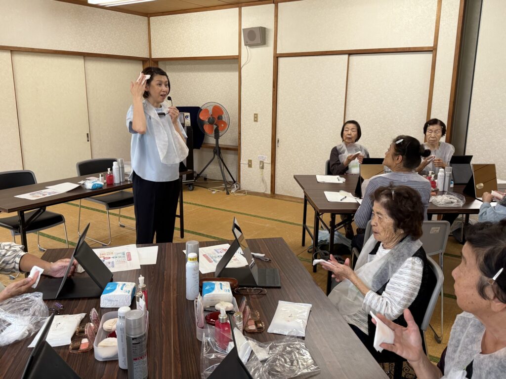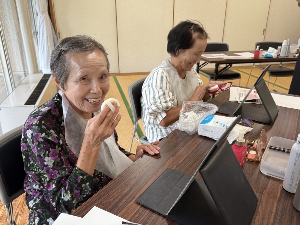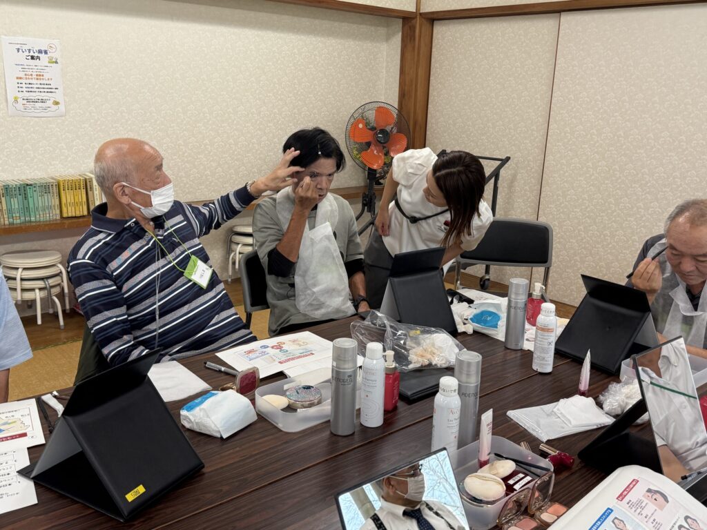 女性だけでなく男性の参加者も多く、その参加者にも配慮があり、清潔感を保つためのケア方法などが紹介され、初めてのメイク体験を含め性別を問わず楽しめる講座となりました。メイクやマッサージを通じて、心も体もほぐれるようなひとときとなり、地域のつながりを感じる温かな時間でした。