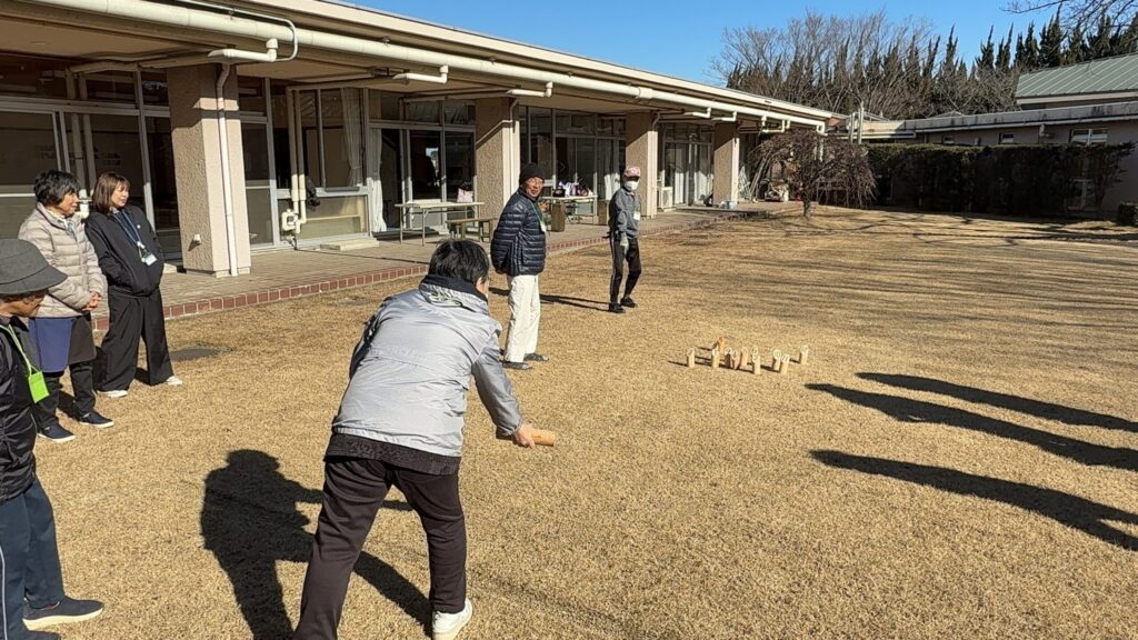 まずは基本ルールの確認と個人練習からスタート。最初は「上手く投げられるかしら」と不安げだった方も、練習を重ねるうちにコツを掴み、狙いすました一投がピンを弾くと「お見事!」と大きな歓声が上がりました。風で戦略が左右される難しいコンディションでしたが、その分、一投一投への集中力が増し、真剣な眼差しが印象的な時間となりました。