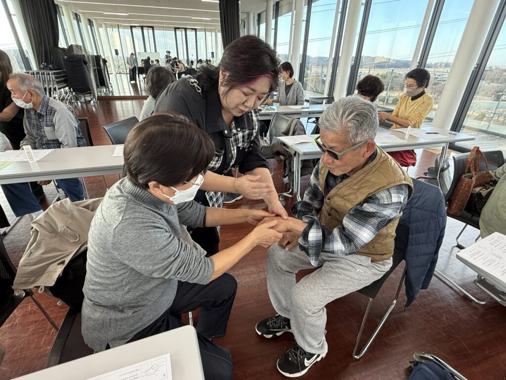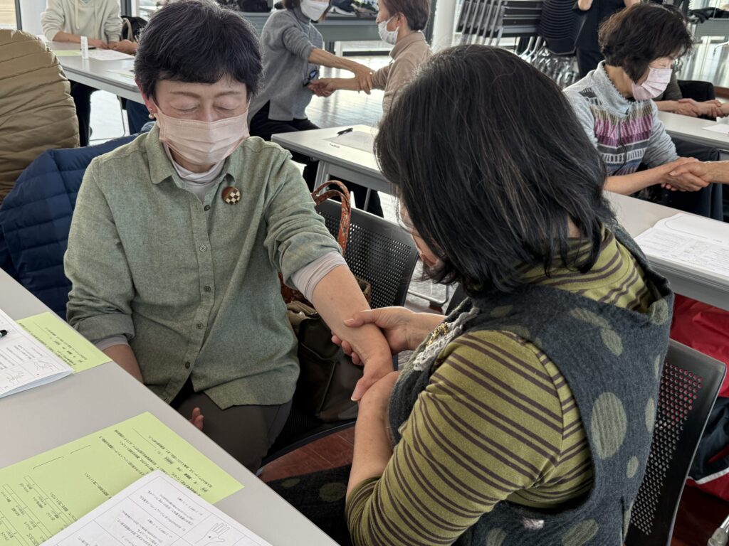 最初は「初めての体験で少し緊張する」と仰っていた参加者の皆様も、いざお互いの手に触れ始めると、会場の空気は一変しました。 講師曰く、本講座で大切にしているのは、単なる専門技術の提供ではなく、手と手を通わせる「手当て」が心を通わせる大切なコミュニケーションスキルであるという点とのこと。実習が進むにつれ、皆様の表情もどんどんほぐれ、「温かくて気持ちいいですね」といった会話が弾み、楽しみながら積極的に学ぼうとする熱気にあふれた時間となりました。